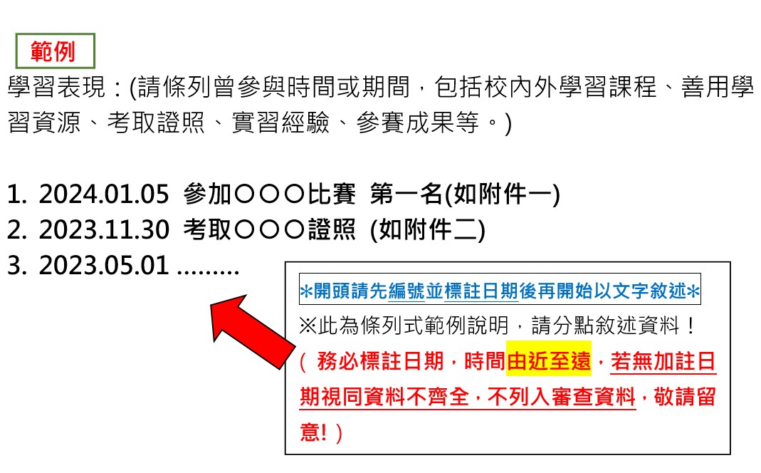 2.獎學金資料填寫格式請參考範例說明(如附件),務必標註日期,排序由近至遠,若無加註日期視同資料不齊,不列入審查資料,敬請留意。