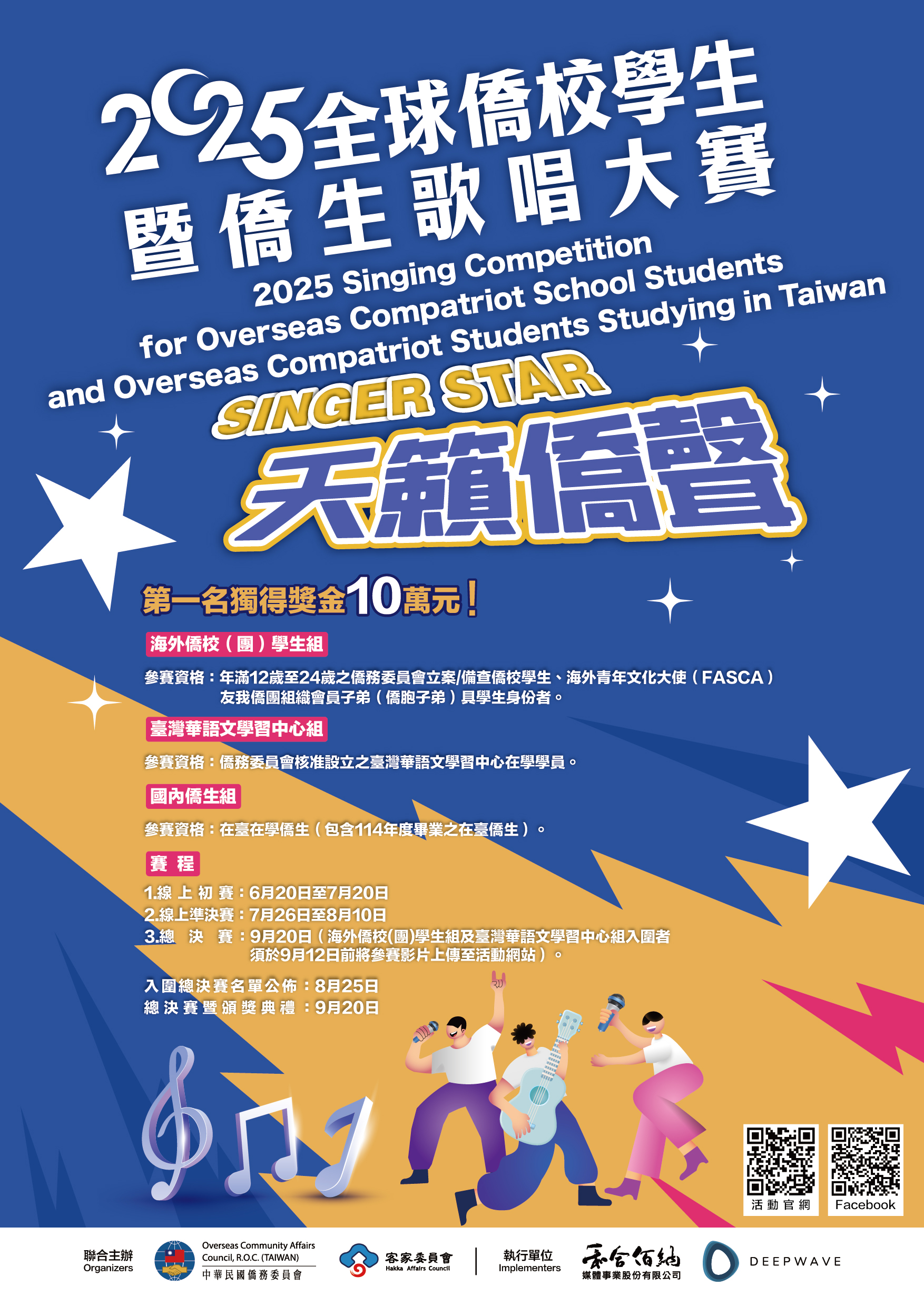 ⚡️ 總決賽:海外僑校(團)學生組及臺灣華語文學習中心組參賽者應於8月26日~9月12日之間上傳參賽影片至活動官網,參賽影片將與國內僑生組參賽者一同於9月20日在臺北流行音樂中心進行最終總決賽。