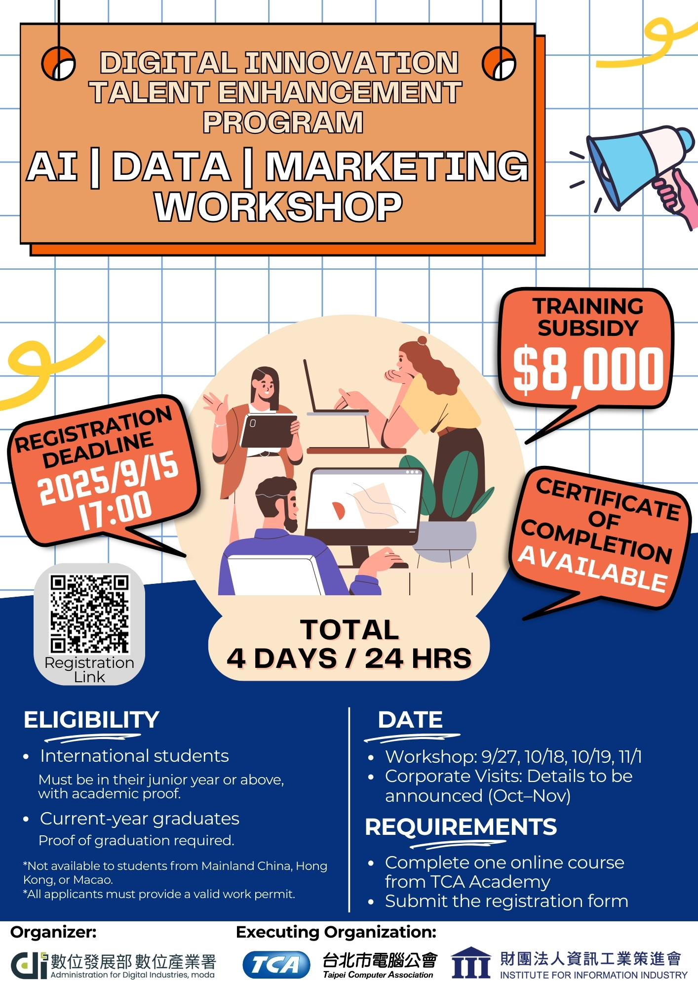 一、為培育具備數位應用能力之國際專業人才,提升國際競爭力,數產署辦理「數位創新人才增能培育計畫」研習活動,透過線上課程、專題研習及企業參訪,培育產業所需之國際數位人才。研習全程免費,並提供完訓獎勵新臺幣8,000元。