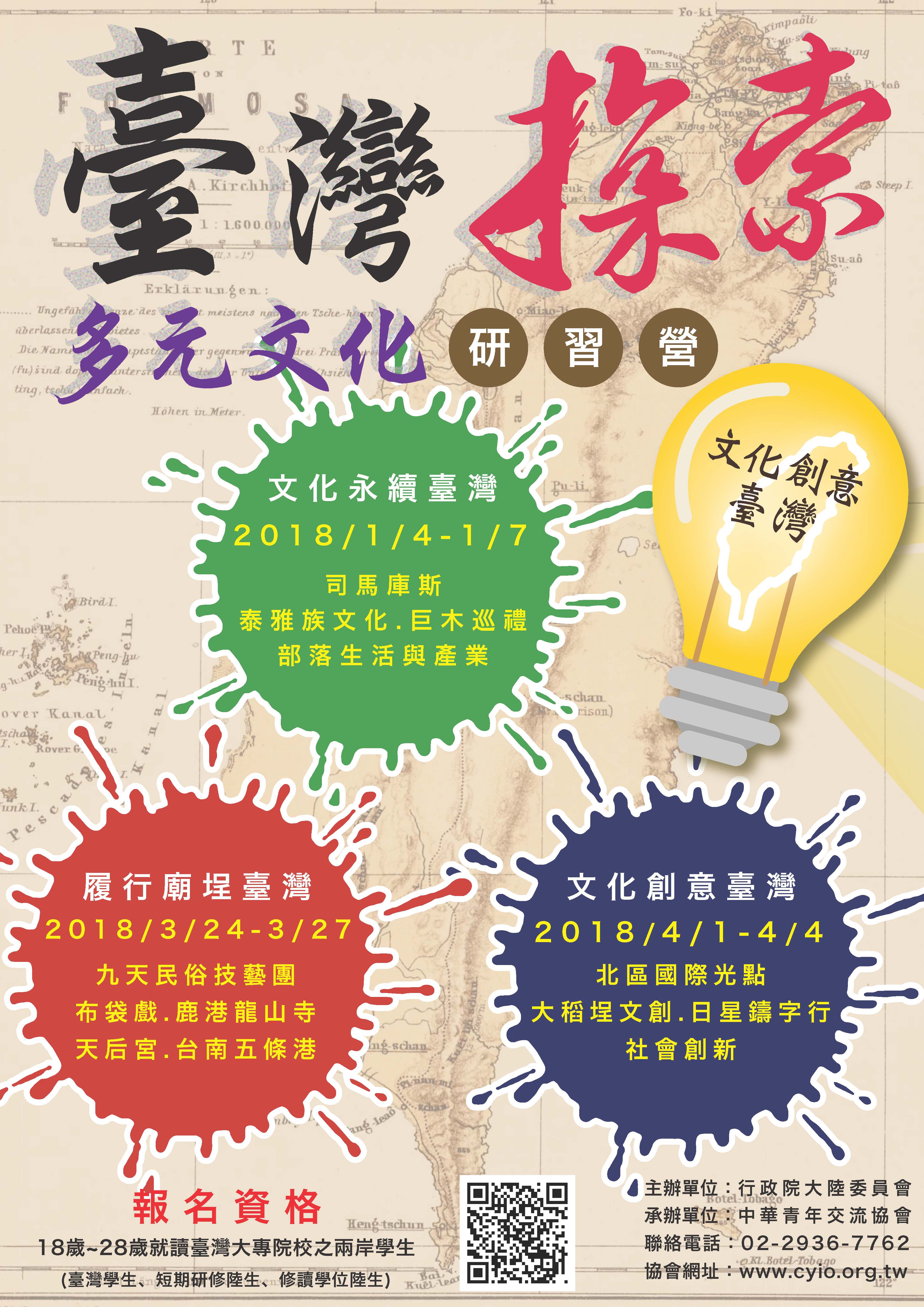 一、為協助臺灣青年發掘在地資產、運用自身優勢,並引導來臺陸生認識臺灣的多元、精緻與活力,在互動中學習彼此包容和欣賞,行政院大陸委員會特別委託本會規劃舉辦「臺灣多元文化探索研習營」,研習營共計三個梯次,擬於107年1月至4月舉行,主題涵蓋文化永續、履行廟埕及文化創意,邀請年滿18~30,就讀臺灣大學院校之臺灣學生、大陸在臺研修生、大陸在臺學位生參加,三個梯次學員共計150位。