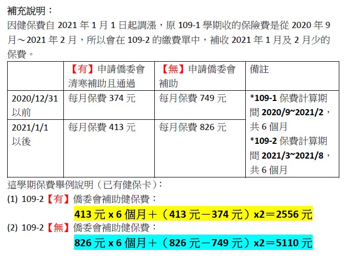 清寒僑生(含港澳生):若有清寒證明,僑務委員會將補助僑生健保費(新臺幣413元/每月),補助後費用:一學期(6個月)/應繳新臺幣2478元。