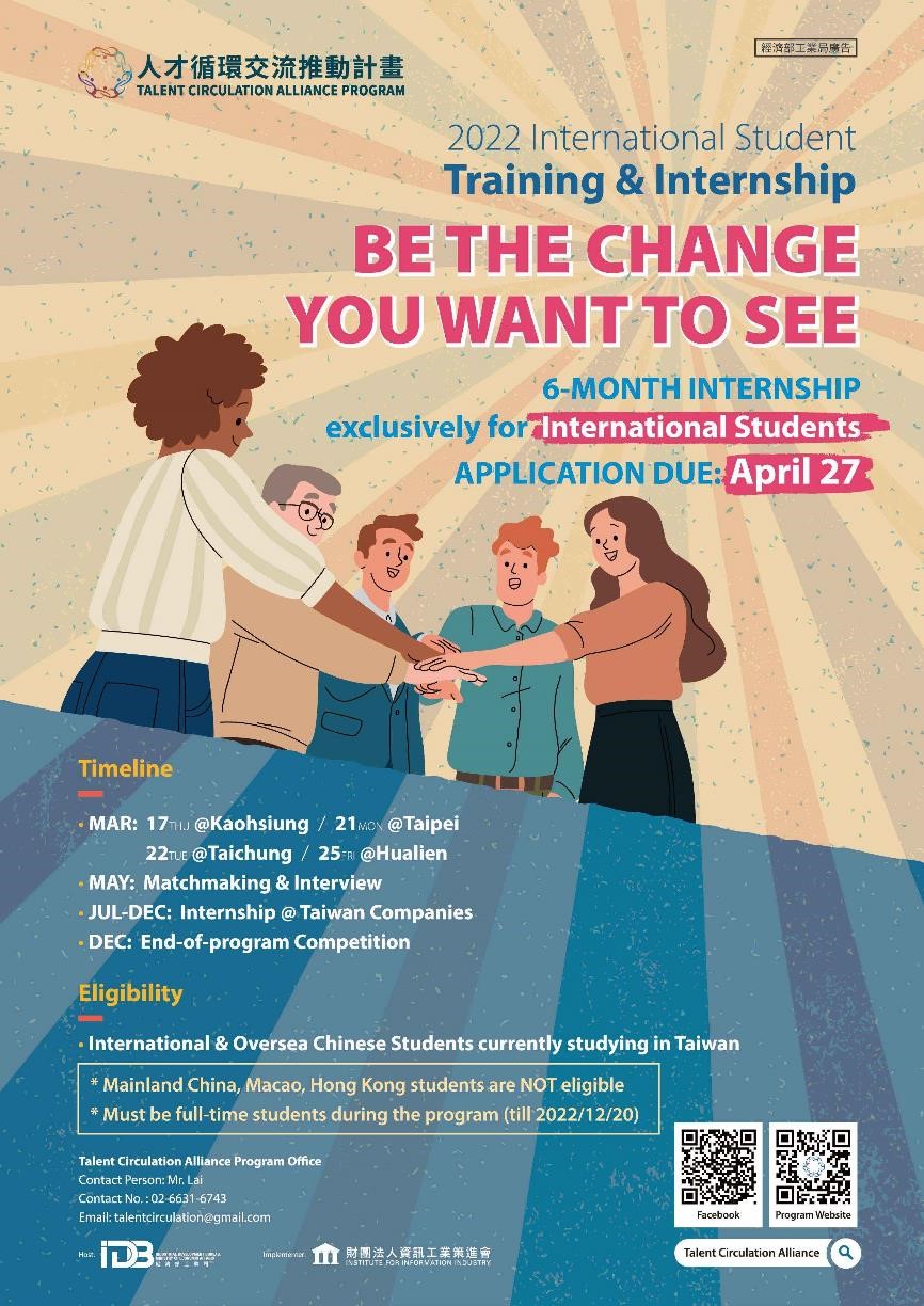 此計畫為臺灣經濟部、美國在台協會(AIT)一同辦理,蔡英文總統極為關注的一項計畫,專門開放近百個實習名額給僑外生,機會難得!不管你是北、中、南、東部的學生,也不管你是人文、商管、電資等背景的學生,不限年齡、不限科系,只要是2022年7月到12月還在台灣的在學學生們,通通歡迎哦!