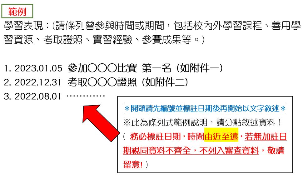 2.獎學金資料填寫格式請參考範例說明(如附件),務必標註日期,排序由近至遠,若無加註日期視同資料不齊,不列入審查資料,敬請留意。